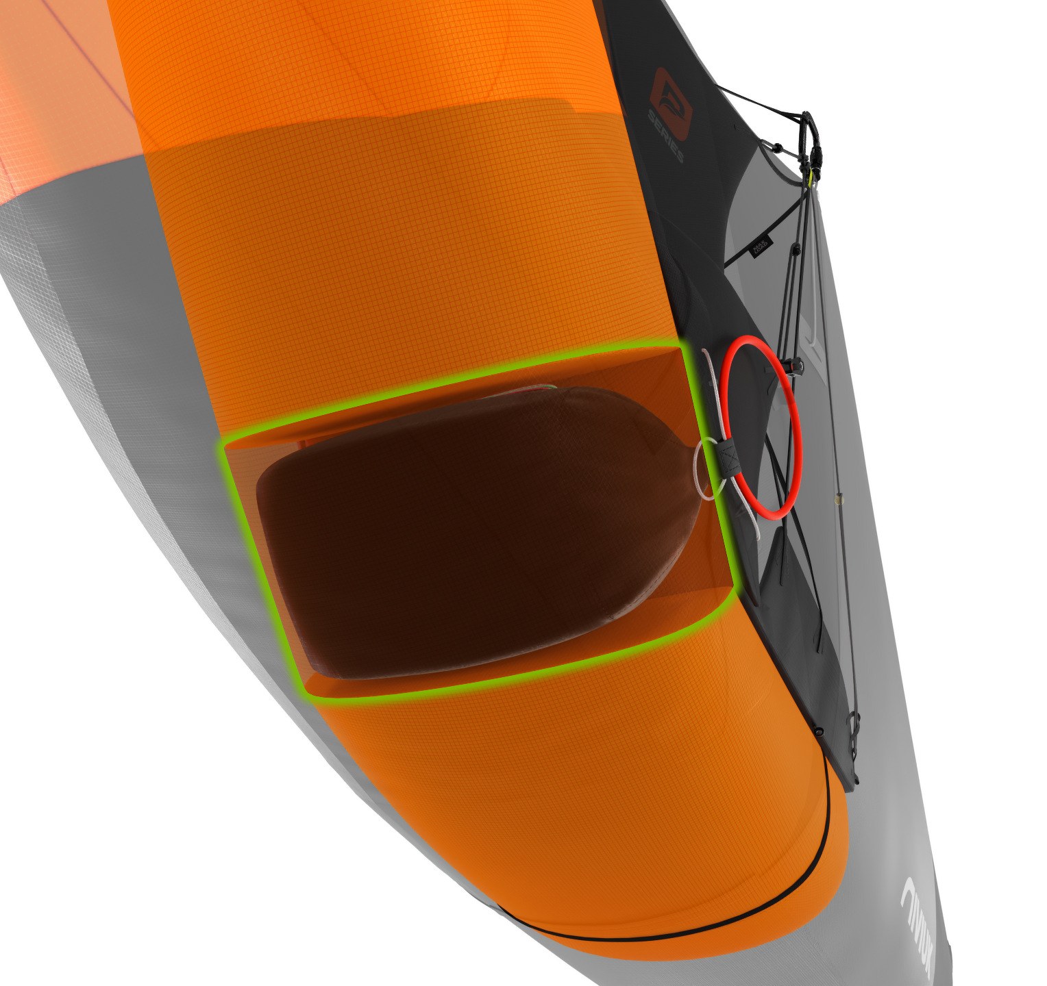 外部にも同様の素材を使用:ポッド本体は軽量かつ耐久性に優れたD70製、その他の部品には高い伸縮性を実現するライクラライトを採用。インフレータブルフェアリングは内側にスカイテックス27g、外側にドクト36gを使用しています。